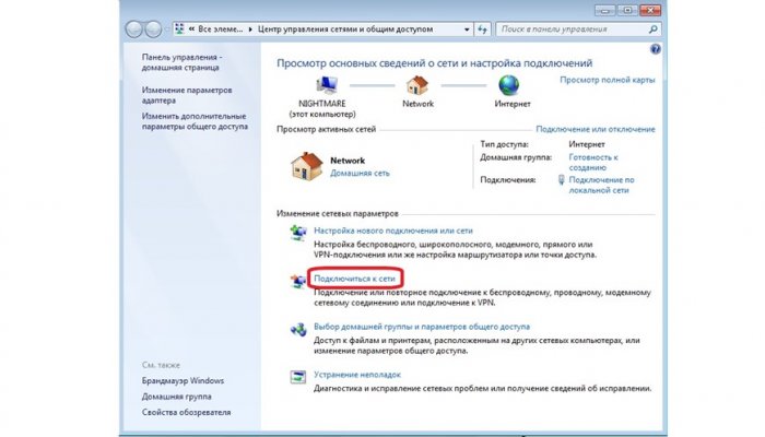 Налаштування благополучно завершена і залишилося лише підключитися до мережі. Щоб це зробити потрібно знову перейти до першого пункту «Центр управління мережами і загальним доступом».