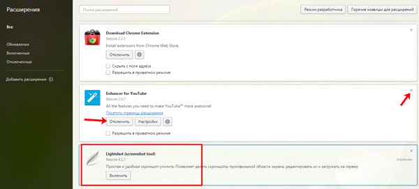 Натиснувши на кнопочку «Відключити» під непотрібним розширенням, ви вимкніть його. Для видалення – натисніть навпроти нього на хрестик.