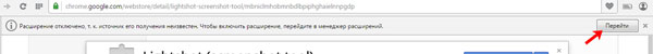 Почекайте трохи. Розширення буде встановлено, але з’явиться віконце, що його джерело невідоме і воно вимкнене. Щоб включити його, потрібно відкрити менеджер доповнень. Для цього натисніть кнопку «Перейти».
