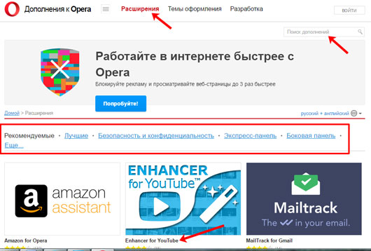 Відкриється нова вкладка, в якій ви побачите різні доповнення до Opera. Тут вам потрібно вибрати розділ «Розширення».