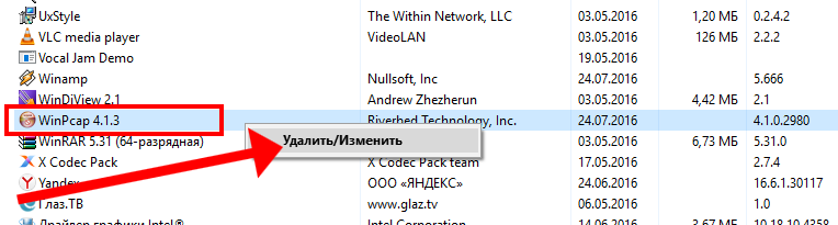 - Після того, як перед вами відкриється вікно з переліком всього встановленого софта, знайдіть ЗА засіб «WinPcap».