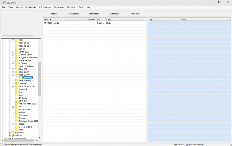 У лівій частині вікна вибираємо папку куди ви скинули фотографію, в центральній вибираємо, власне, фотографію. Вибирати потрібно фотографію без обробки в Photoshop, Lightroom або будь-якого іншого фоторедактора. Так як вони змінюють дані Exif, а нам потрібна інформація. Я знімаю в RAW, тому і вибираю відповідно файл цього формату.