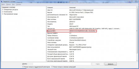 3. Відкриється вікно «Відомості про систему», в якому ви можете побачити всі можливі характеристики вашого комп’ютера. Адже Нам необхідно знати тільки версію BIOS, тому знаходимо однойменну рядок: «Версія BIOS». Результат пошуку на малюнку нижче обведений червоним прямокутником.