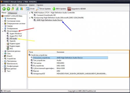 Тепер, щоб дізнатися більш детальну інформацію про вашої звукової карти вам необхідно скористатися програмою Everest або будь-яким іншим аналогічним софтом. В Everest у розділі «Мультимедіа» знаходимо підрозділ «HD Audio». Тут ви знайдете усю детальну інформацію про вашої звукової карти (опис пристрою, ID пристрою, тип шини, версію тощо).