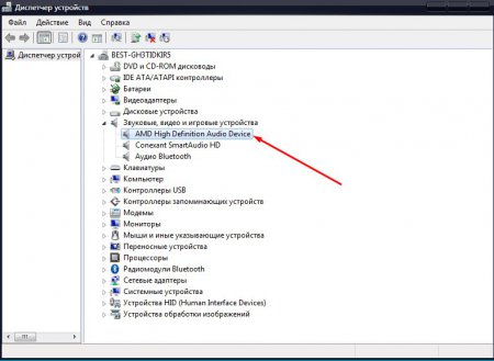 На зображенні стрілочкою я показав, що в якості звукової карти на моєму ноутбуці використовується «AMD High Definition Audio Device». Відповідно звукова карта виготовлена компанією AMD (Advanced Micro Devices).