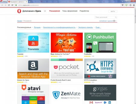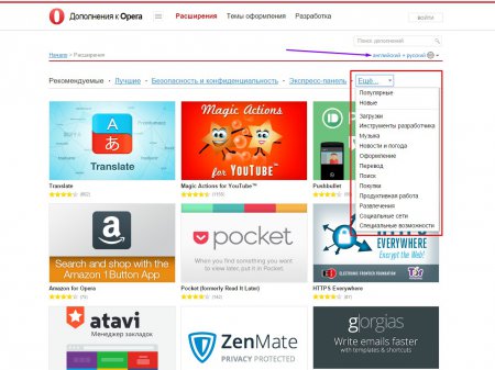 Автоматично відкриється нова вкладка «Доповнення до Opera», в якій ви можете вибрати мову відображення розширень або вибрати потрібну категорію.