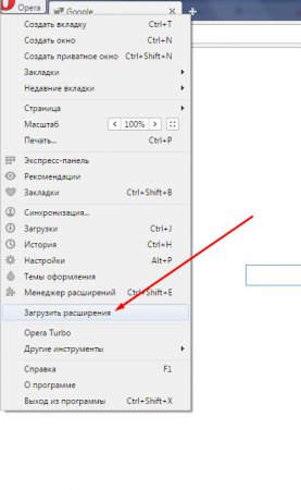 Для початку відкрийте сам браузер. Потім відкрийте список налаштувань і управління опери і відшукайте кнопку «Завантажити розширення».