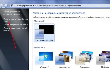 Далі відповідно відкриється нове вікно з налаштуваннями зображення та звуку на вашому комп’ютері. Нам необхідно звернути увагу на ліву частину цього вікна, в якому є невелике меню. У цьому меню знайдіть пункт «Змінити піктограми робочого столу» і клацніть по ній.