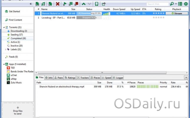 - Після того, як ви встановили програму, заходьте на будь торрент сайт і вибирайте потрібний файл для скачування файл. Скачивайте торрент файл і запускайте його через встановлену програму uTorrent і файл потихеньку почне выкачиваться вам на комп’ютер. Швидкість і час завантаження залежать від кількості роздають користувачів в даний момент часу (тобто коли ви выкачиваете файл).