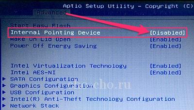 Якщо функціональні клавіші не допомогли, слід перевірити, чи запущений тачпад в БІОС. Для цього слід увійти в BIOS і зайти в меню з управлінням вбудованими пристроями. Найчастіше це меню «Advanced» і пункт «Internal Pointing Device». Необхідно переконатися, що пункт має статус «Enabled», це означає, що пристрій увімкнено.