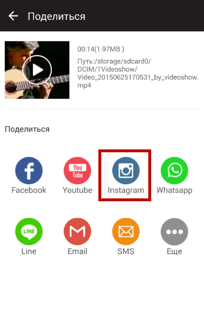 • Для публікації отредактиированного відео перейдіть на сторінку «Поділитися» і тапніте по значку «Instagramm».