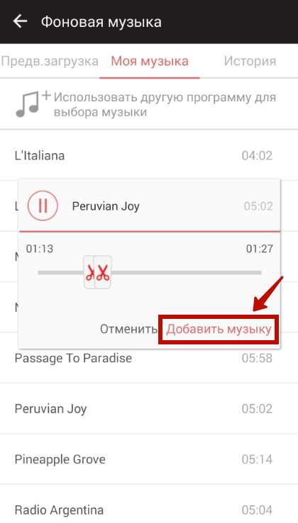• C допомогою повзунка зробіть фрагментовану різання аудіофайлу — натисніть «Додати музику».