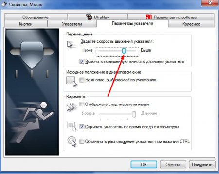 Далі в цій вкладці знаходимо розділ «Переміщення». В ньому ми маємо можливість як раз і задати швидкість руху вказівника миші (чутливість). Переміщуючи повзунок змінюємо швидкість і робимо її вище або нижче.