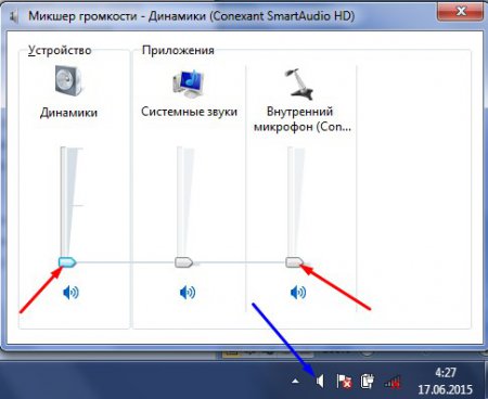 Щоб налаштувати гучність відтворення необхідно клацнути по відповідній кнопці. Далі повзунок потрібно потягнути вгору. Таким чином, ви збільшите гучність динаміків. Аналогічно настроюється і гучність навушників (якщо вони підключені) або мікрофона. Всі ці налаштування проводяться у невеликому діалоговому вікні «Мікшер гучності».