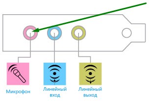 Для початку вам необхідно переконається, що ви правильно підключили мікрофон. На фотографії нижче ви побачите роз’єми, які є на кожному системному блоці. Стрілкою показано, в якій роз’єм необхідно застромити шнур від мікрофона.