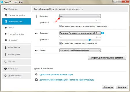 Якщо у вас виникли проблеми з самим мікрофон або ви його не правильно підключили, то навпроти графи мікрофон, в випадаючому списку, буде висвітлюватися слово «ні». Саме це найперший і найголовніший пункт настроювання мікрофона в Skype.