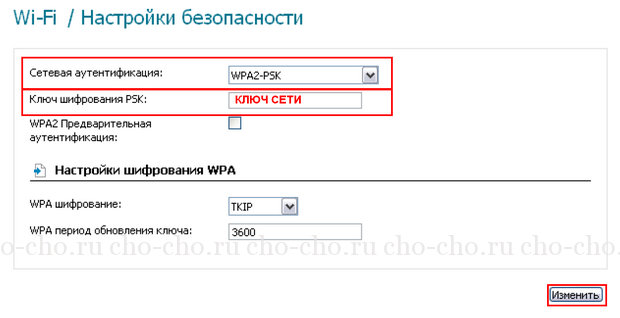 У цій же вкладці Вай-фай слід вибрати розділ «Налаштування безпеки», де потрібно встановити пароль на Wi-Fi маршрутизатора. Для цього в полі «Мережевий аутентифікації» вибирається режим WPA2-PSK, ввести ключ шифрування PSK» необхідний пароль для точки доступу і зберегти введені дані.