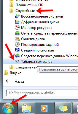 Клікніть на кнопку «Пуск», потім виберіть «Всі програми» – «Стандартні» – «Службові» – «Таблиця символів».