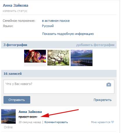 Пояснювати тут особливо нічого, тому стаття вийде дуже коротенька. І так, заходимо на свою сторінку і в тому місці, де ви пишіть на стіні, починаємо складати своє повідомлення з перекресленими словами.