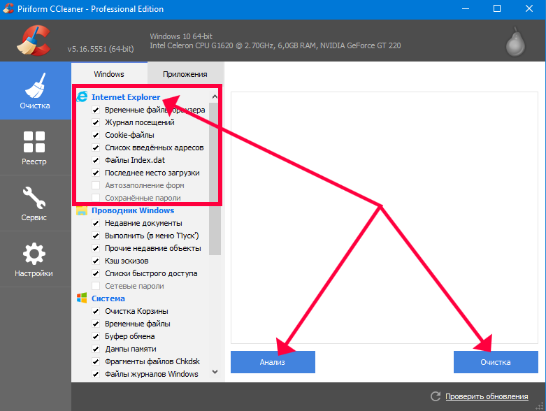 - У лівому стовпчику знімаємо галочки крім блоку «Internet Explorer» і тиснемо кнопку «Аналіз».