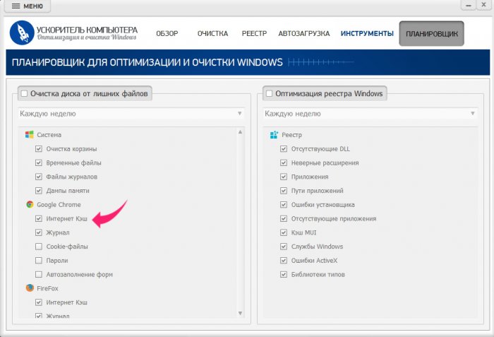Тут же доступний спеціальний планувальник, який здатний автоматизувати процес перевірки пк на наявність «зайвих файлів». Всі свої перевірки «Прискорювач» перевірить у фоновому режимі без участі користувача.