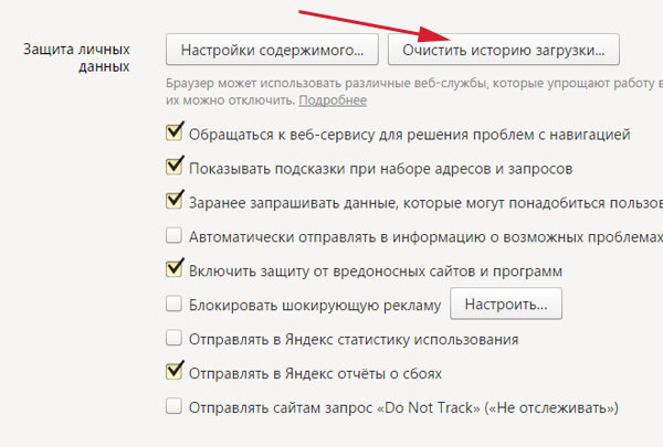 Знаходимо рядок «Захист особистих даних» і натискаємо навпроти неї на кнопку «Очистити історію завантаження»: