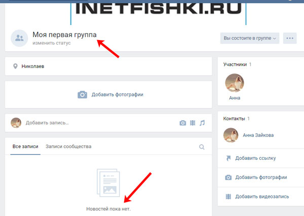 Поверніться до своєї сторінки Вконтакті і відкрийте групу, зі стіни якій Ви тільки що видалили всі записи. У мене стіна очистилася, і замість публікацій відображається напис «Новин поки немає».