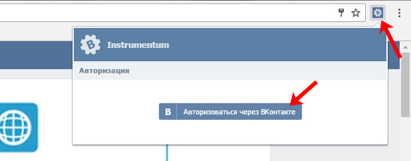 У правому верхньому куті браузера з’явиться значок встановленого розширення – натисніть на нього. Потім натисніть на кнопку «Увійти через ВКонтакте».
