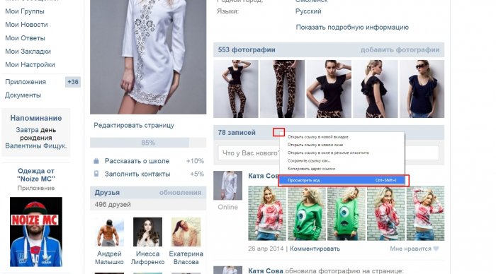 Для даного способу не потрібно ніяких програм, також понад знання програмування теж не знадобляться. Ми зазвичай користуємося просто входом в «Подивитися код». І так відкриваємо ту сторінку ВК, на якій хочете видалити усі записи на стіні. Натискаємо на саму стіну зверху правою кнопкою миші і вибираємо «Подивитися код».