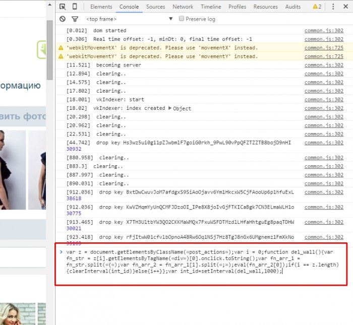 var z = document.getElementsByClassName(«post_actions»);var i = 0;function del_wall(){var fn_str = z[i].getElementsByTagName(«div»)[0].onclick.toString();var fn_arr_1 = fn_str.split(«{«);var fn_arr_2 = fn_arr_1[1].split(«;»);eval(fn_arr_2[0]);if(i == z.length){clearInterval(int_id)}else{i++}};var int_id=setInterval(del_wall,1000);