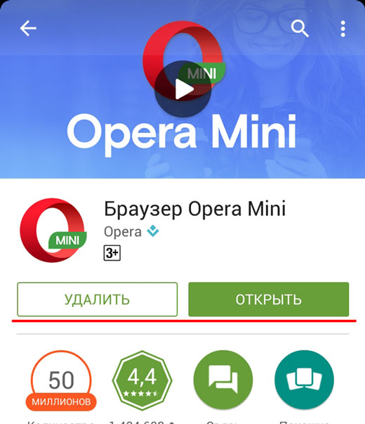 Відкриється Play Market. Якщо для вашої мобільної версії браузера будуть знайдені оновлення, то замість кнопочок «Видалити» і «Відкрити», які на скріншоті, ви побачите «Оновити». Натисніть на неї, щоб завантажити останню версію Опери на телефон або планшет з Android.