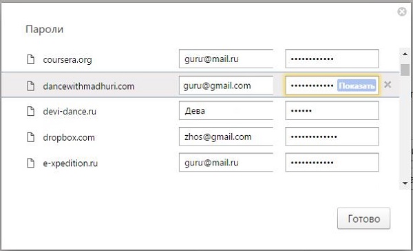 У вікні управління паролів ви побачите список сайтів з збереженими на них паролями, а також перелік сайтів, паролі для яких не зберігаються. Щоб подивитися який-небудь пароль досить вибрати в зазначеному переліку ресурс зі збереженим паролем, і натиснути на кнопку «Показати» праворуч.
