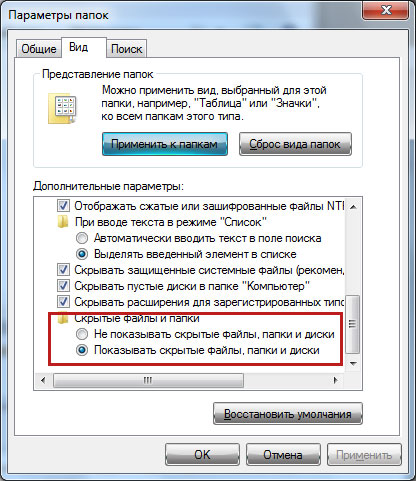 Переходимо у вкладку «Вид» і ставимо перемикач «Показувати приховані файли, паки і диски»: