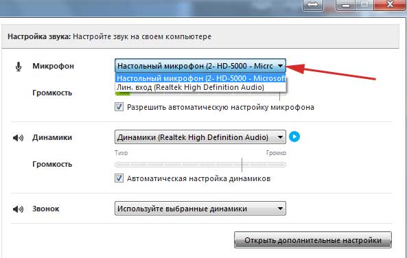 Зверніть увагу на пункт «Мікрофон», там можна вибирати з декількох пристроїв, якщо у вас в системі встановлений ні один мікрофон. Наприклад, у вас один вбудований, а інший ви купили окремо стаціонарний, спеціально для розмов. Так ось, в цій опції він і обирається.
