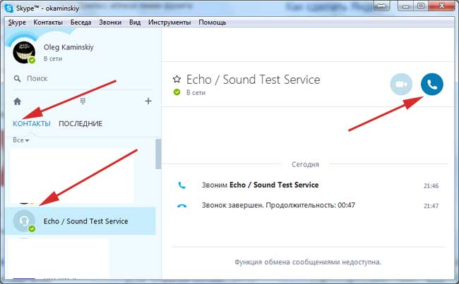 Запускаємо програму і заходимо в «КОНТАКТИ», там знаходимо контакт «Echo/Sound Test Service». Дзвонимо туди, а далі перевіряємо.