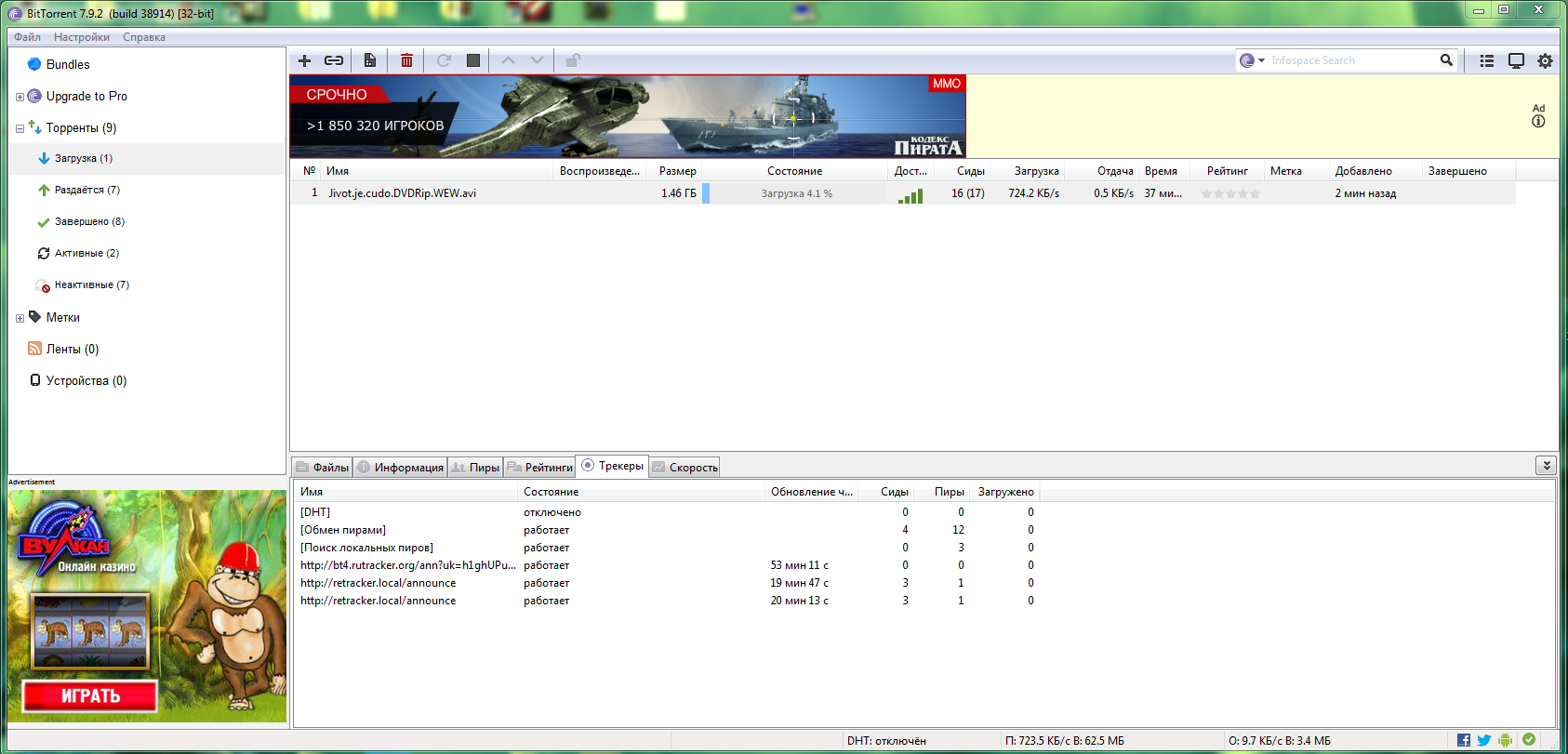 У торрент-клієнтів швидкість зазвичай вказується в кілобайтах і мегабайтах, а не в мегабітах і кілобітах, як у вашого провайдера. Тому швидкість, яку показує ваш торрент-клієнт сміливо множте на 8.