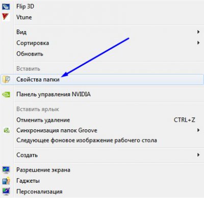 1. На робочому столі Windows 7 потрібно викликати контекстне меню натиском правої кнопки миші. В ньому виберіть пункт «Властивості папки».