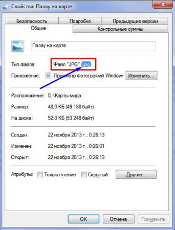 2. У вікні властивостей, у вкладці “Загальні” знаходимо розділ “Тип файлу“. В цьому розділі якраз і буде вказано розширення файлу. В моєму випадки розширення файлу “.jpg”.