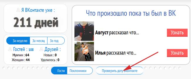 Але це не саме основне перевагу цього додатка. Тут є функція, за допомогою якої ми зможемо дізнатися дату реєстрації кожного користувача. Для цього тиснемо на кнопочку «Перевірити дату Вконтакте»: