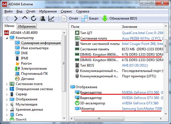 Показує абсолютно всі параметри ПК до найдрібніших подробиць. Наприклад, якщо ви хочете докупити оперативну пам’ять, то в AIDA64 можна дізнатися про неї все: повна назва, частоту і т. д. Аналогічна інформація відображається за процесора, відеокарти, монітора.