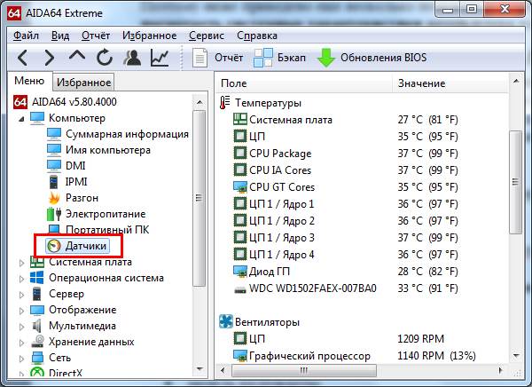 До речі, серед усього іншого, ця програма також показує температуру комплектуючих (у вкладці «Датчики»). Це дуже корисно, коли ваш ПК або ноутбук почав раптом сильно глючити, і потрібно перевірити гріється процесор або відеокарту.
