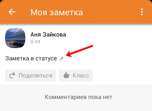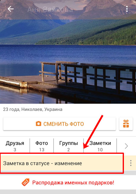 Якщо Ви завантажили мобільний додаток Однокласники і заходите через нього з телефону або планшета в цю соціальну мережу, тоді відкрийте бічне меню і клацніть по своєму імені. Відкриється головна сторінка Вашого профілю. Під аватаркою і пунктами меню знаходиться світло руда область з заміткою, яка додана статус. Щоб її змінити, клікніть по тексту замітки.