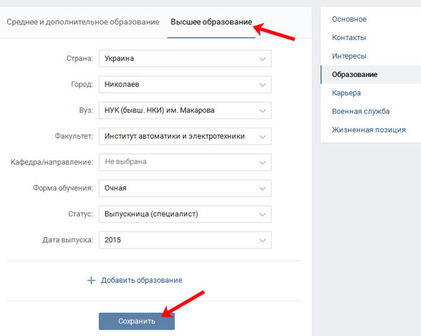 Якщо Ви навчалися на бакалавра в одному інституті, а магістратуру закінчували в іншому, тоді спочатку вкажіть перший інститут, потім натисніть кнопку «Додати освіту» і заповніть дані про другий інститут.