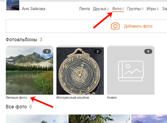 Вгорі клікніть по кнопочці «Фото». Потім відкрийте альбом «Особисті фото».
