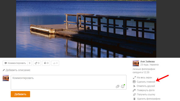 У режимі перегляду фотографії, перегорніть сторінку вниз. У меню праворуч, ви побачите посилання «Зробити головною», натисніть на неї.