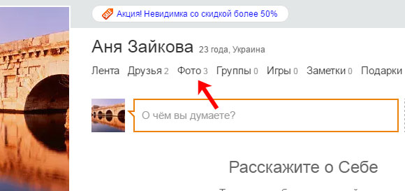 Щоб зробити головним одну з завантажених фотографій в Однокласниках, клікніть по кнопочці «Фото», яка знаходиться під ім’ям вашого профілю.
