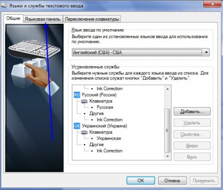 4. Це відкриється нове діалогове вікно «Мови та служби текстового вводу». Вам необхідно перейти у вкладку «Мовна панель».