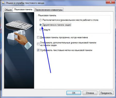 5. У цій вкладці нам необхідний самий перший розділ налаштувань «Мовна панель». В цьому розділі якраз і настроюється розташування мовної панелі. В нашому випадку потрібно повернути мовну панель на панель завдань. Отже, встановіть прапорець навпроти напису «Закріплена в панелі завдань».