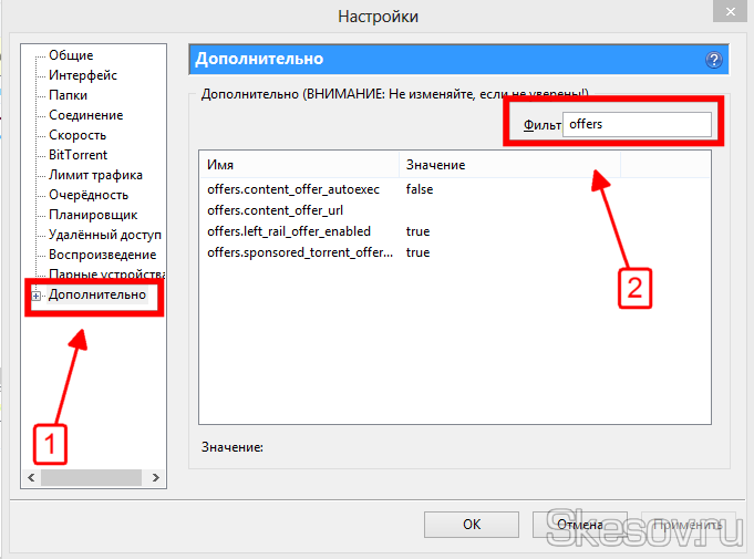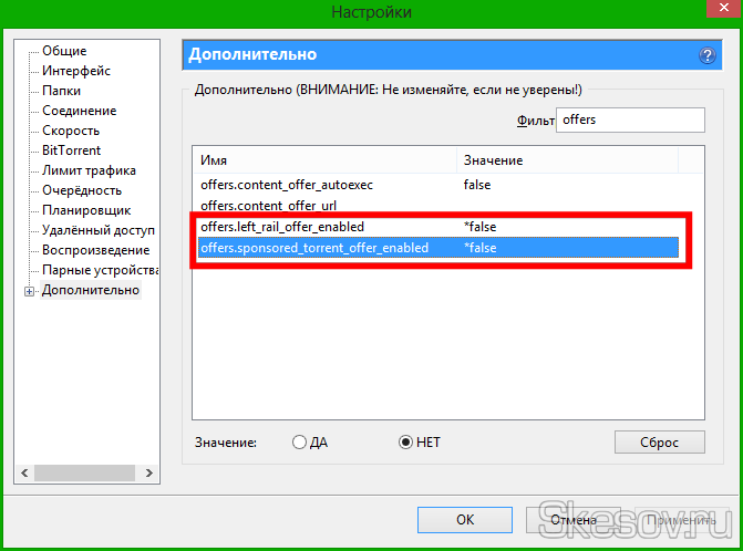 3) Міняємо значення параметрів «offers. left_rail_enabled» і «offers.sponsored_torrent_offer_enabled» на false. Для цього подвійним клацанням клікаєм по обом пунктам. Також можна вибрати по черзі обидва пункти і вибрати внизу «Немає»: