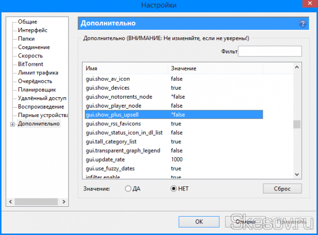 5) Тепер позбавляємося від згадки про версії uTorrentPlus, для цього в тому ж списку шукаємо gui.show_plus_upsell і так само виставляємо false.